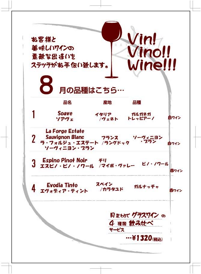 トラットリアステッラでは、月替わりでグラスワインの4種類飲み比べサービスを行っております。